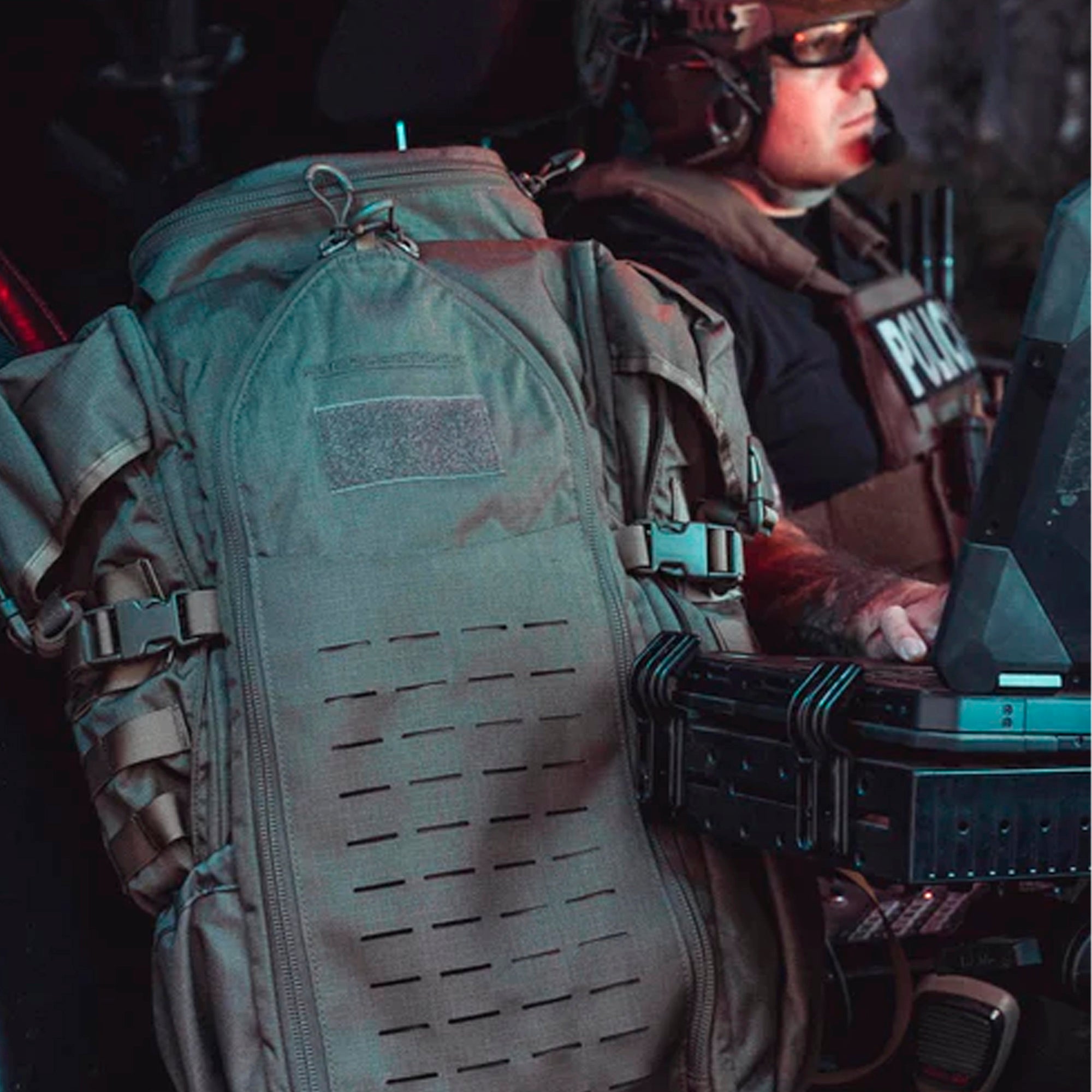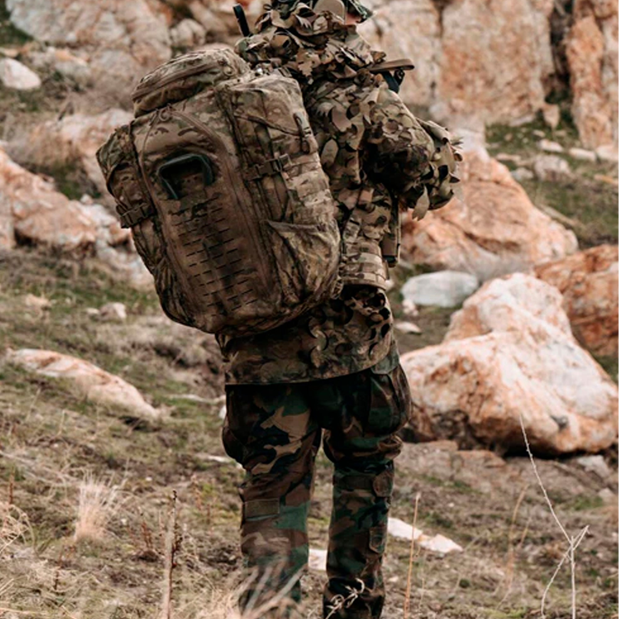 Der Rucksack ist für den professionellen Einsatz optimiert und verfügt über eine interne Funkhalterung für PRC-117-Funkgeräte, zwei interne Fächer für Trinkblasen sowie ein faltbares Organisationsregal, mit dem sich die Ausrüstung übersichtlich unterteilen lässt. Der Zugang erfolgt sowohl von oben als auch über die Front, was schnellen Zugriff auf den Inhalt in jeder Situation ermöglicht.