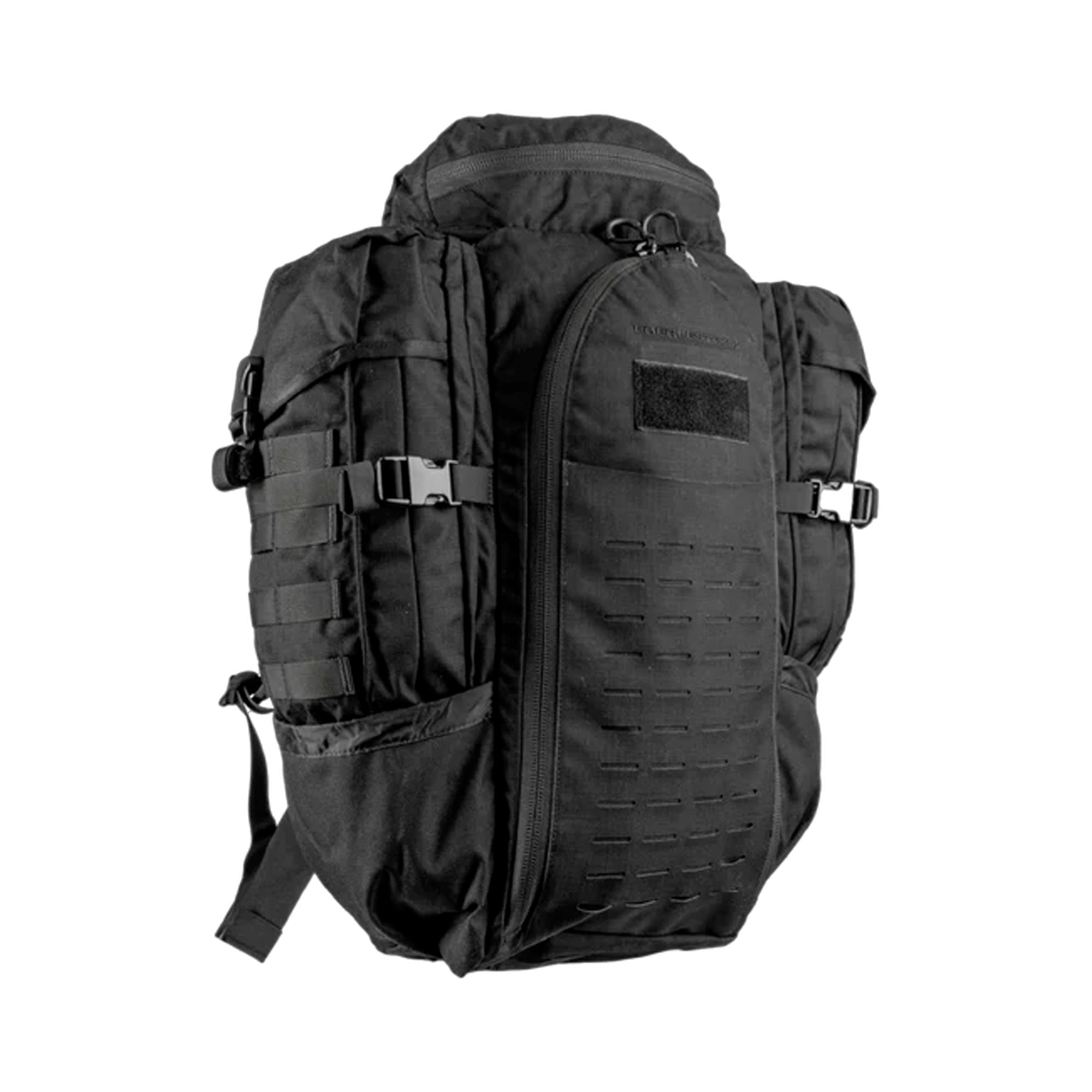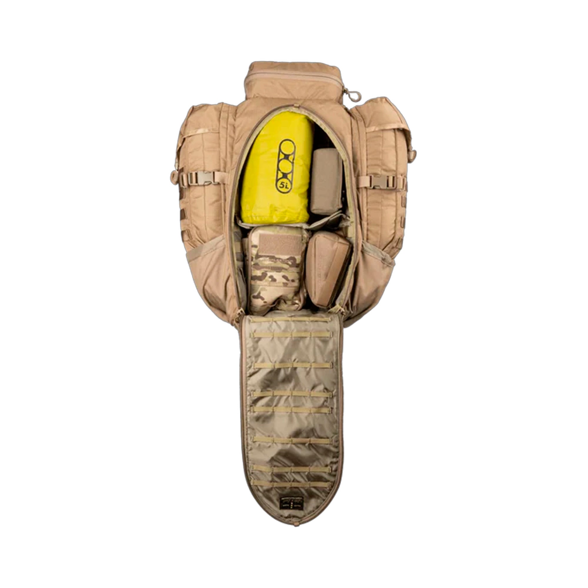 Der Rucksack ist für den professionellen Einsatz optimiert und verfügt über eine interne Funkhalterung für PRC-117-Funkgeräte, zwei interne Fächer für Trinkblasen sowie ein faltbares Organisationsregal, mit dem sich die Ausrüstung übersichtlich unterteilen lässt. Der Zugang erfolgt sowohl von oben als auch über die Front, was schnellen Zugriff auf den Inhalt in jeder Situation ermöglicht.